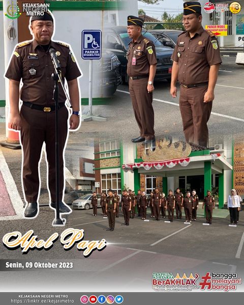 Pada Hari ini Senin, 09 Oktober 2023 Kepala Sub Bagian Pembinaan Ferdy Andryan S.H., M.H Memimpin Pelaksanaan Apel Pagi bertempat di Halaman Kantor Kejaksaan Negeri Metro yang diikuti Oleh Para Kasi, dan seluruh pegawai.