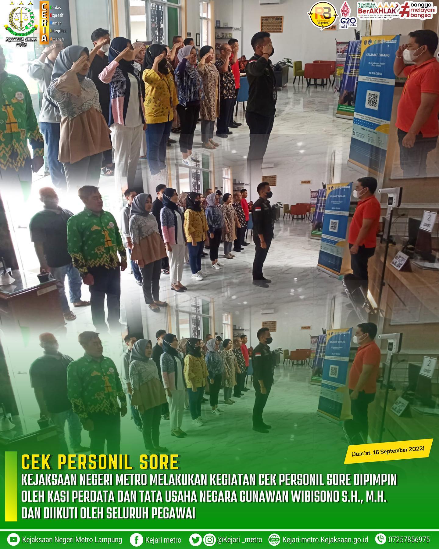 Kejaksaan Negeri Metro melakukan kegiatan cek personil sore dipimpin oleh kasi perdata dan tata usaha negara Gunawan Wibisono S.H., M.H. dan diikuti oleh seluruh pegawai.