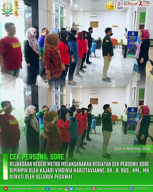 Kejaksaan Negeri Metro Melaksanakan kegiatan Cek Personil Sore Dipimpin oleh kajari Virginia Hariztavianne, SH., B. BUS., MM., MH. diikuti oleh seluruh pegawai.