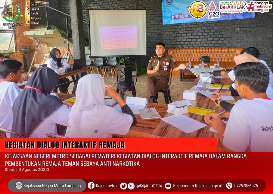 (Senin, 8 Agustus 2022) Kejaksaan Negeri Metro Sebagai pemateri kegiatan Dialog Interaktif Remaja Dalam Rangka Pembentukan Remaja Teman Sebaya Anti Narkotika.