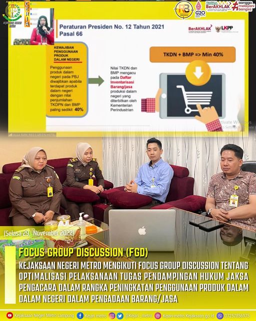 Kejaksaan Negeri Metro Mengikuti Focus Group Discussion Tentang Optimalisasi Pelaksanaan Tugas Pendampingan Hukum Jaksa Pengacara Dalam Rangka Peningkatan Penggunaan Produk Dalam Dalam Negeri Dalam Pengadaan Barang/Jasa.