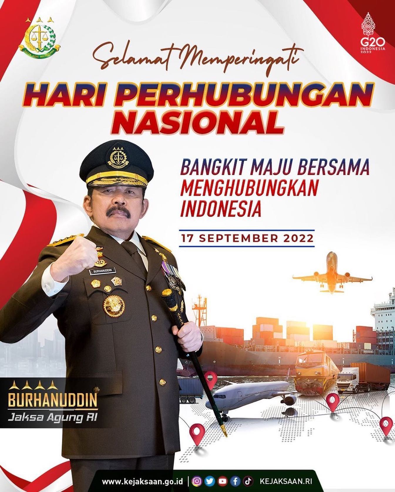 Jaksa Agung RI Burhanuddin beserta jajaran mengucapkan selamat Hari Perhubungan Nasional, 17 September 2022. Bangkit maju bersama menghubungkan Indonesia.