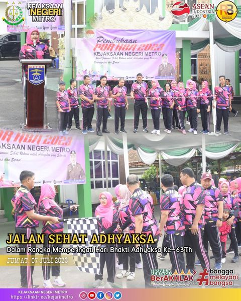 kejaksaan negeri metro melaksanakan kegiatan jalan sehat dalam rangka memperingati hari bhakti adhyaksa ke 63Th 2023 di kantor kejaksaan negeri metro.