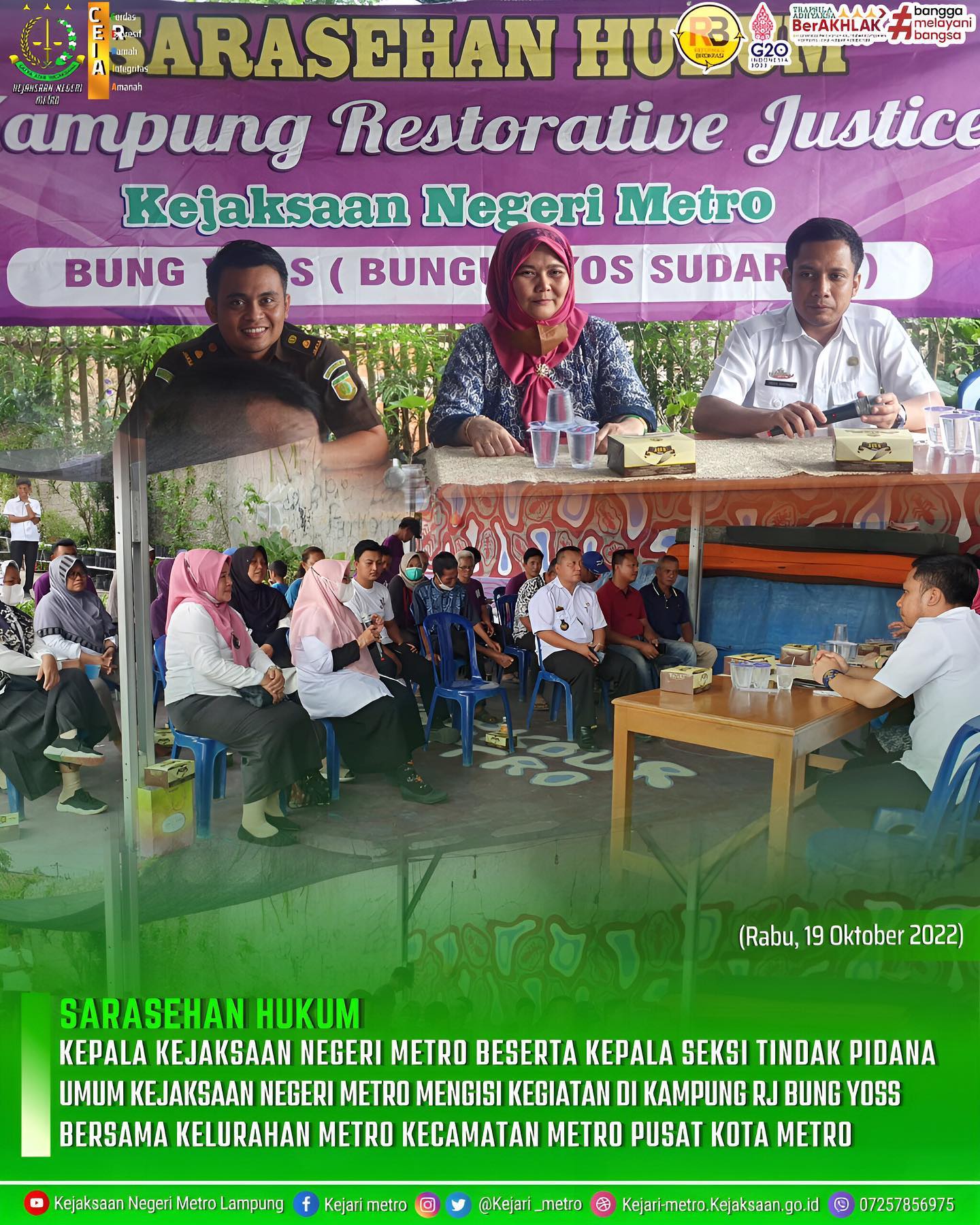 Kepala Kejaksaan Negeri Metro Beserta Kepala Seksi Tindak Pidana Umum Kejaksaan Negeri Metro mengisi kegiatan di Kampung RJ Bung Yoss Bersama Kelurahan Metro Kecamatan Metro Pusat Kota Metro.