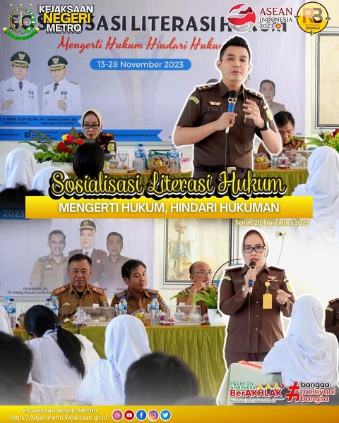 pada hari ini senin, 20 november 2023 kejaksaan negeri metro menjadi narasumber dalam kegiatan literasi hukum dengan mengusung tema ; mengerti hukum, hindari hukuman bertempat di Smp Negeri 10 Metro dalam rangka mendukung terwujudnya generasi emas metro cemerlang(Gemerlang)
