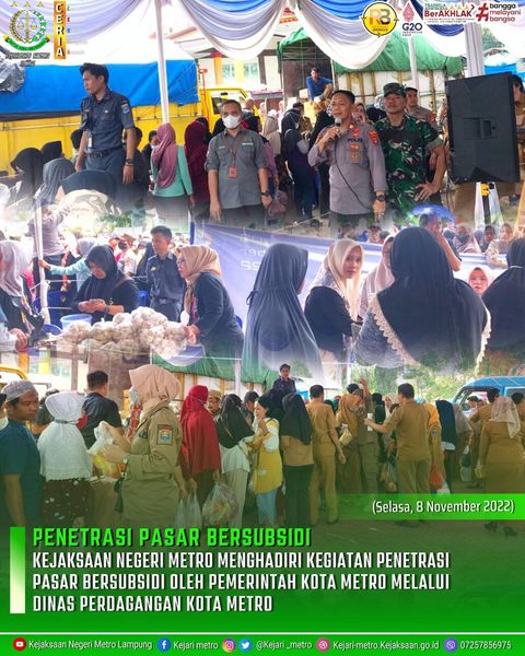 (Selasa, 8 November 2022) Kejaksaan Negeri Metro Menghadiri Kegiatan Penetrasi Pasar Bersubsidi Oleh pemerintah Kota Metro Melalui Dinas Perdagangan Kota Metro yang di Selenggarakan di Lapangan Samber Kota Metro.