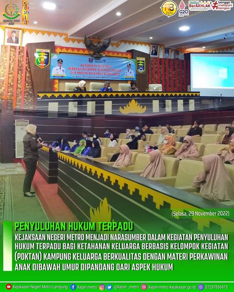 (Selasa, 29 November 2022) Kejaksaan Negeri Metro Menjadi Narasumber Dalam Kegiatan Penyuluhan Hukum Terpadu Bagi Ketahanan Keluarga Berbasis Kelompok Kegiatan (POKTAN) Kampung Keluarga Berkualitas Dengan Materi Perkawinan Anak Dibawah Umur Dipandang Dari Aspek Hukum.