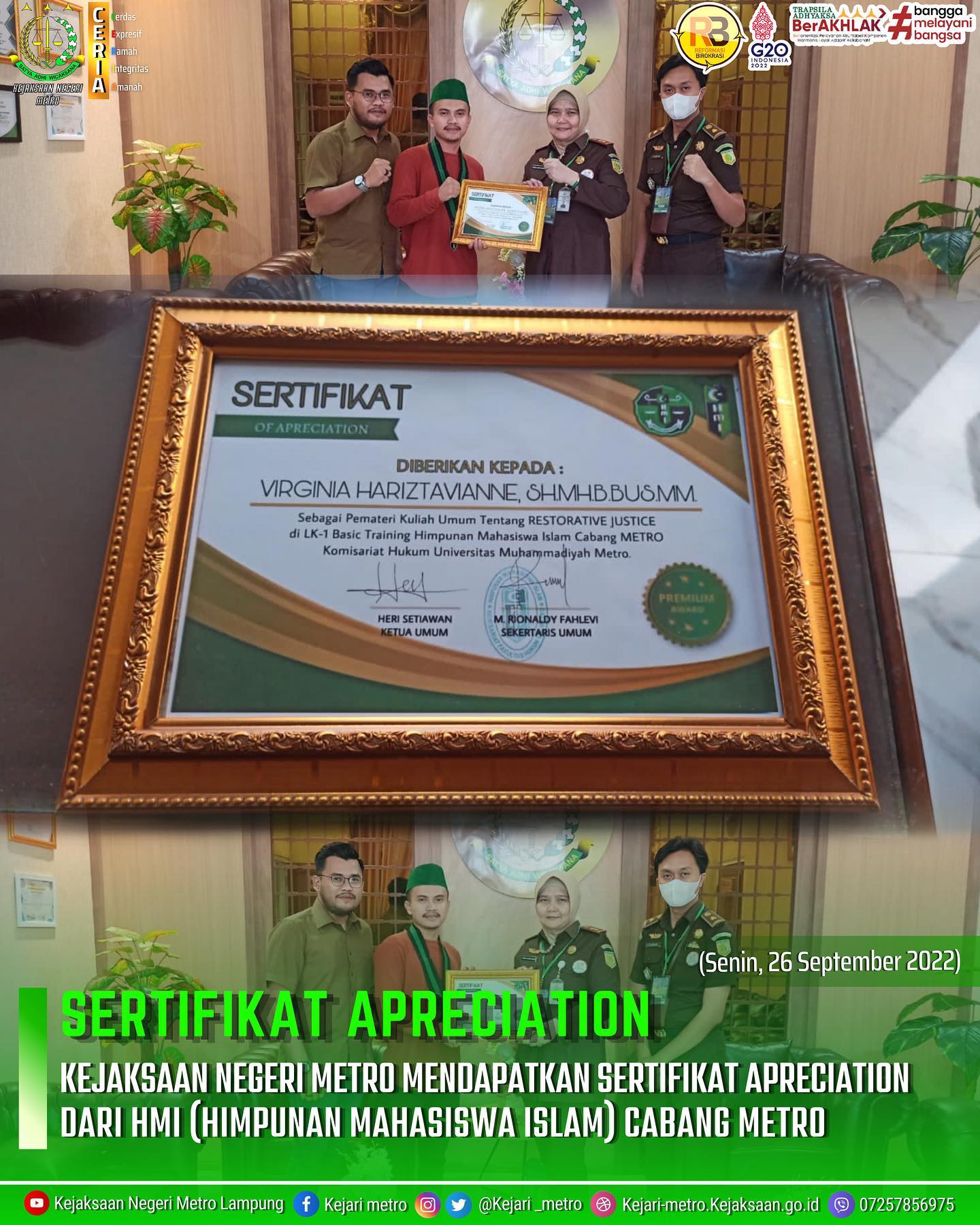 Kejaksaan Negeri Metro Mendapatkan Sertifikat Apreciation dari HMI (Himpunan Mahasiswa Islam) Cabang Metro.