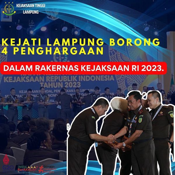 Kejaksaan Tinggi Lampung menerima 4 penghargaan yang diberikan langsung oleh Wakil Jaksa Agung Republik Indonesia Dr. Sunarta mewakili Jaksa Agung ST Burhanuddin dalam Rapat Kerja Nasional Kejaksaan RI Tahun 2023 yang pelaksanaanya dimulai sejak tanggal 04 Januari 2023 sampai dengan 06 Januari 2023. @kejaksaan.ri