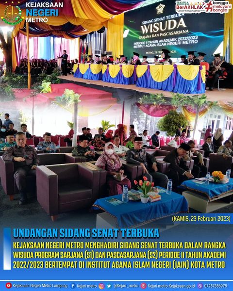 (Kamis, 23 Februari 2023) Kejaksaan Negeri Metro Menghadiri Sidang Senat Terbuka Dalam Rangka Wisuda Program Sarjana (S1) Dan Pascasarjana (S2) Periode II Tahun Akademi 2022/2023 Bertempat Di Institut Agama Islam Negeri (IAIN) Kota Metro.