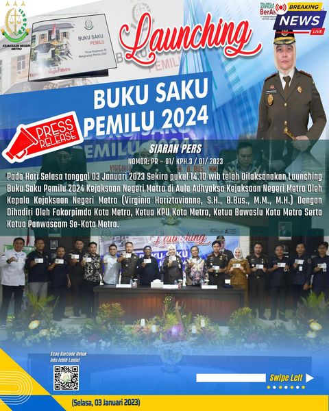 Bahwa pada hari Selasa tanggal 03 Januari 2023 sekira pukul 14.10 wib telah dilaksanakan Launching Buku Saku Pemilu 2024 Kejaksaan Negeri Metro di Aula Adhyaksa Kejaksaan Negeri Metro oleh Kepala Kejaksaan Negeri Metro (Virginia Hariztavianne, S.H., B.Bus., M.M., M.H.) dengan dihadiri oleh Fokorpimda Kota Metro, Ketua KPU Kota Metro, Ketua Bawaslu Kota Metro serta Ketua Panwascam se-Kota Metro.