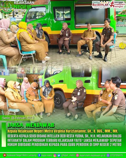 Kepala Kejaksaan Negeri Metro Virginia Hariztavianne, SH., B. BUS., MM., MH. Beserta Kepala Seksi Bidang Intelijen Debi Resta Yudha, S.H., M.H. Melakukan Dialog Interaktif Dalam Program Terbaru Kejaksaan Yaitu “Jaksa Menjawab” Seputar Hukum Dibidang Pendidikan Kepada Para Guru Pendidik di SMP Negeri 2 Metro.