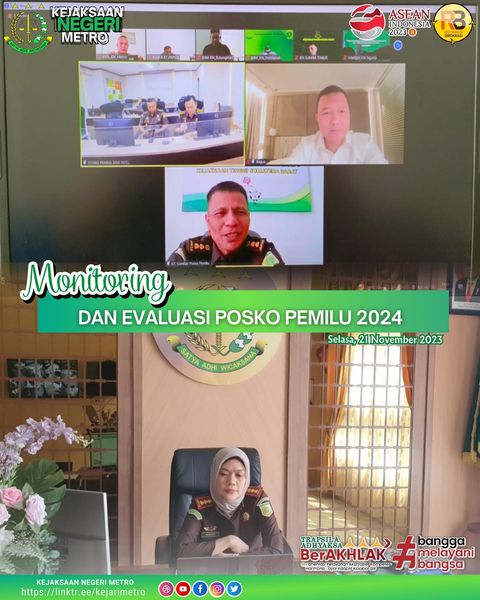 Kepala Kejaksaan Negeri Metro Nurvita Kusumadardani, S.H Kepala Seksi Intelijen, Plt. Kasubsi B pada Seksi Intelijen Mengikuti Monitoring dan Evaluasi Posko Pemilu 2024 dalam rangka mengoptimalisasi posko pemilu 2024 secara peran, fungsi dan kegiatan agar dapat bekerja secara maksimal.