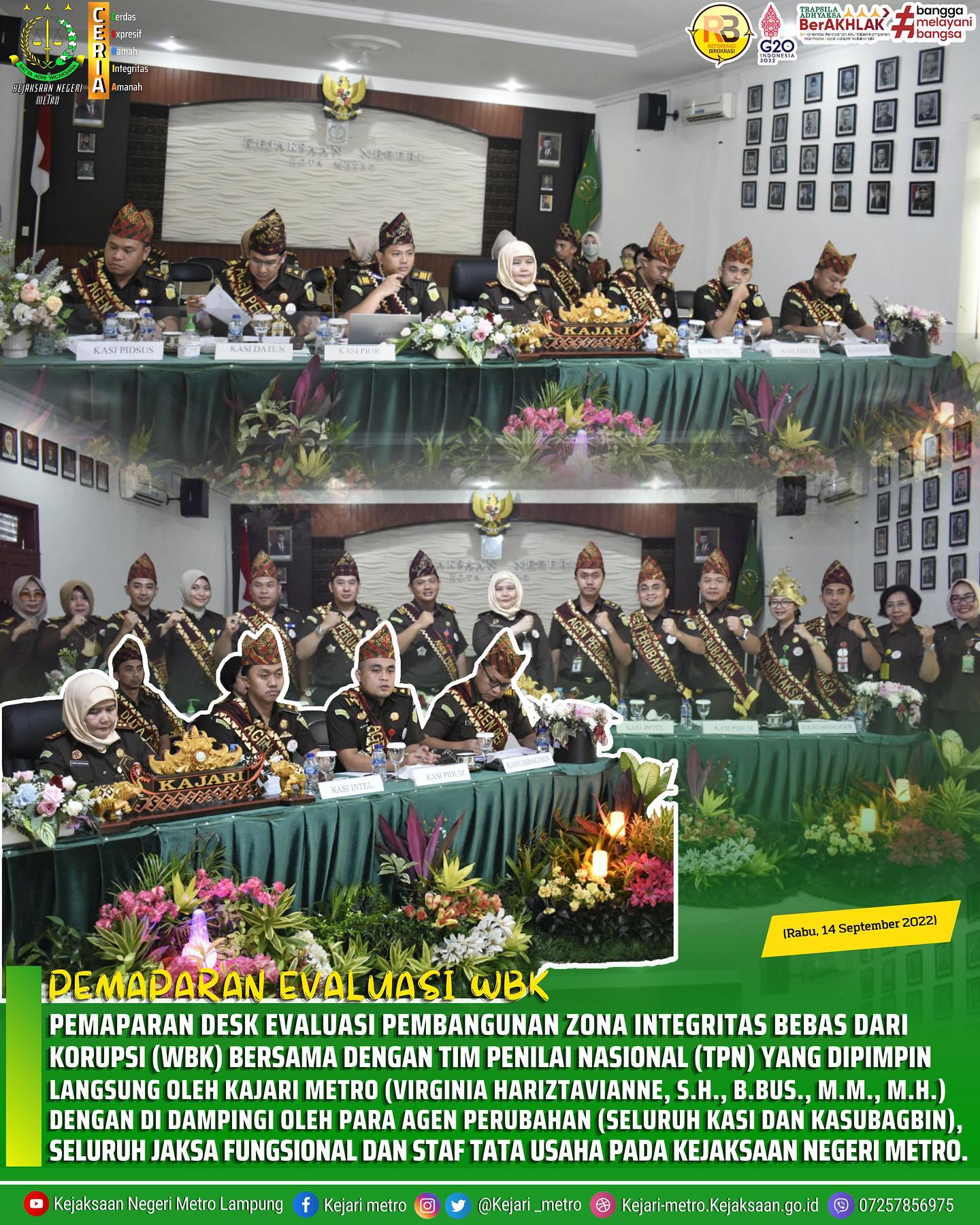 Kejaksaan Negeri Metro melakukan pemaparan Desk Evaluasi Pembangunan Zona Integritas Wilayah Bebas dari Korupsi (WBK) bersama dengan Tim Penilai Nasional (TPN) yang dipimpin langsung oleh Kepala Kejaksaan Negeri Metro (Virginia Hariztavianne, S.H., B.Bus., M.M., M.H.) dengan di dampingi oleh Para Agen Perubahan (Seluruh Kasi dan Kasubagbin), seluruh Jaksa Fungsional dan Staf Tata Usaha pada Kejaksaan Negeri Metro di aula Kejaksaan Negeri Metro.