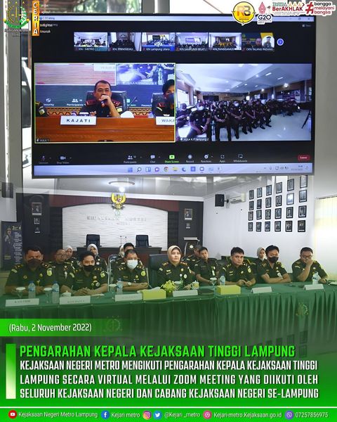 Kejaksaan Negeri Metro Mengikuti Pengarahan Kepala Kejaksaan Tinggi Lampung Secara Virtual Melalui zoom meeting yang diikuti oleh seluruh Kejaksaan Negeri dan Cabang Kejaksaan Negeri se-Lampung.