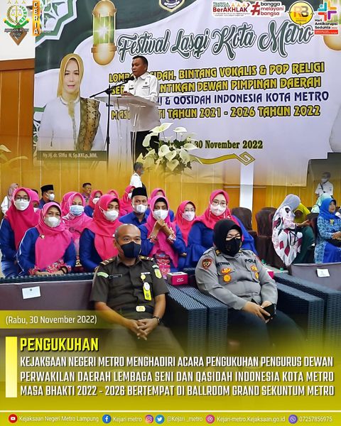Kejaksaan Negeri Metro Menghadiri Acara Pengukuhan Pengurus Dewan Perwakilan Daerah Lembaga Seni dan Qasidah Indonesia Kota Metro Masa Bhakti 2022 – 2026 Yang Bertempat Di ballroom Grand Sekuntum Metro.