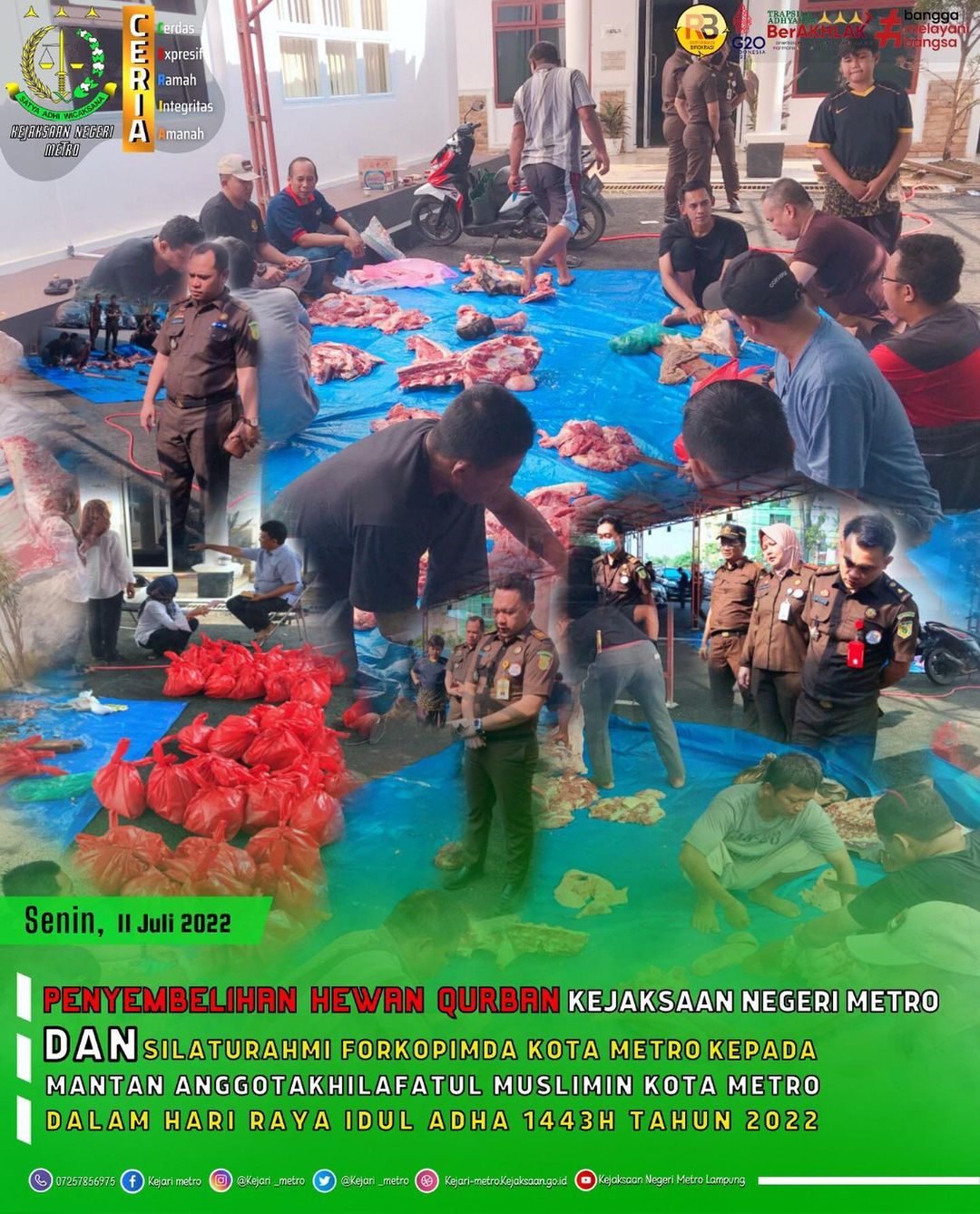 Kegiatan penyembelihan hewan qurban Kejaksaan Negeri Metro dan Silaturahmi Forkopimda Kota Metro Kepada mantan anggota khilafatul muslimin Kota Metro dalam rangka Hari Raya Idul Adha 1443h Tahun 2022.
