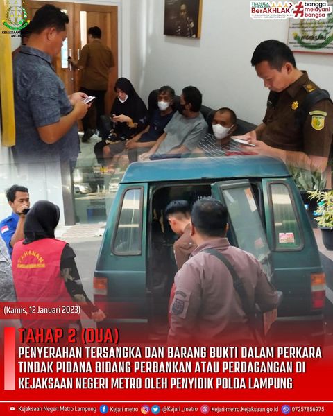 pada hari Kamis tanggal 12 Januari 2023 sekira pukul 12.00 wib telah dilaksanakan Penyerahan Tersangka dan Barang Bukti Dalam Perkara Tindak Pidana Bidang Perbankan atau Perdagangan di Kejaksaan Negeri Metro oleh Penyidik Polda Lampung.