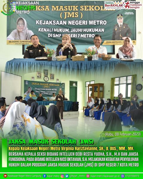 Kepala Kejaksaan Negeri Metro Virginia Hariztavianne, SH., B. BUS., MM., MH. Bersama Kepala Seksi Bidang Intelijen Debi Resta Yudha, S.H., M.H dan Jaksa Fungsional Pada Bidang Intelijen Nico Oktavian, S.H. Melakukan Kegiatan Penyuluhan Hukum Dalam Program Jaksa Masuk Sekolah (JMS) di SMP Negeri 7 Kota Metro.