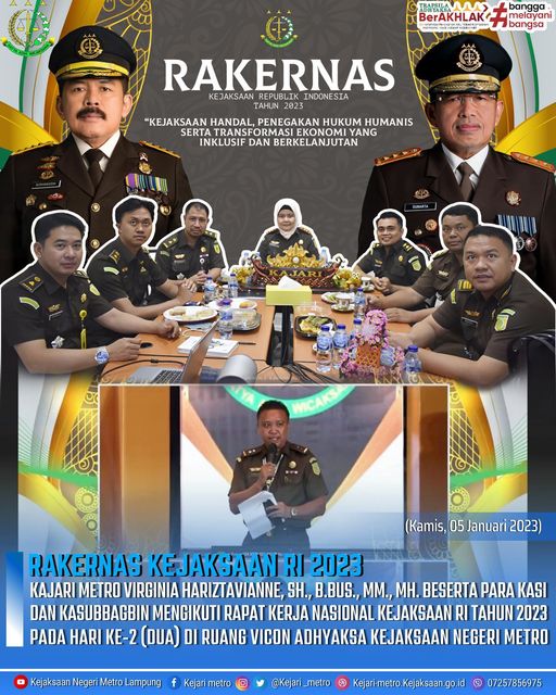 Kajari Metro Virginia Hariztavianne, SH., B.BUS., MM., MH. Beserta Para Kasi dan Kasubbagbin Mengikuti Rapat kerja Nasional Kejaksaan RI Tahun 2023 pada Hari Ke-2 (Dua) di Ruang Vicon Adhyaksa Kejaksaan Negeri Metro. dengan Mengusung tema; “ Kejaksaan Handal, Penegak Hukum Humanis Serta Transformasi Ekonomi Yang Inklusif dan Berkelanjutan.