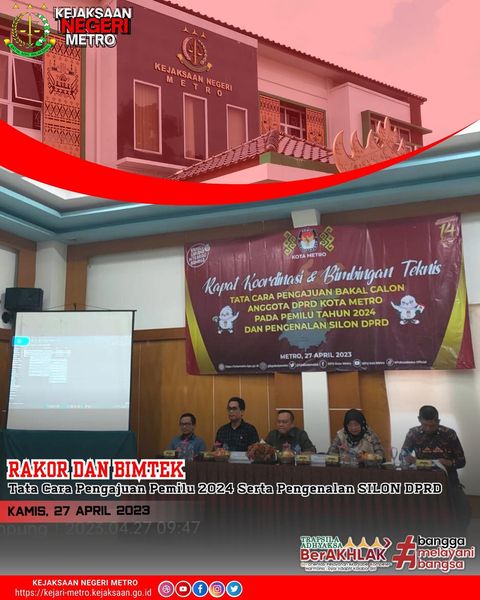 Kejaksaan Negeri Metro Menghadiri Rapat Koordinasi dan Bimbingan Teknik tentang tata cara pengajuan bakal calon anggota Dprd kota metro pada pemilu tahun 2024 dan pengenalan SILON Dprd.