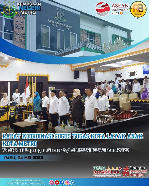 Kepala Kejaksaan Negeri Metro Virginia Hariztavianne, S.H., B.Bus., M.M., M.H Menghadiri Rapat Koordinasi Gugus Tugas Kota Layak Anak Kota Metro dalam rangka Verifikasi Lapangan Secara hybrid (VLA) KLA Tahun 2023.