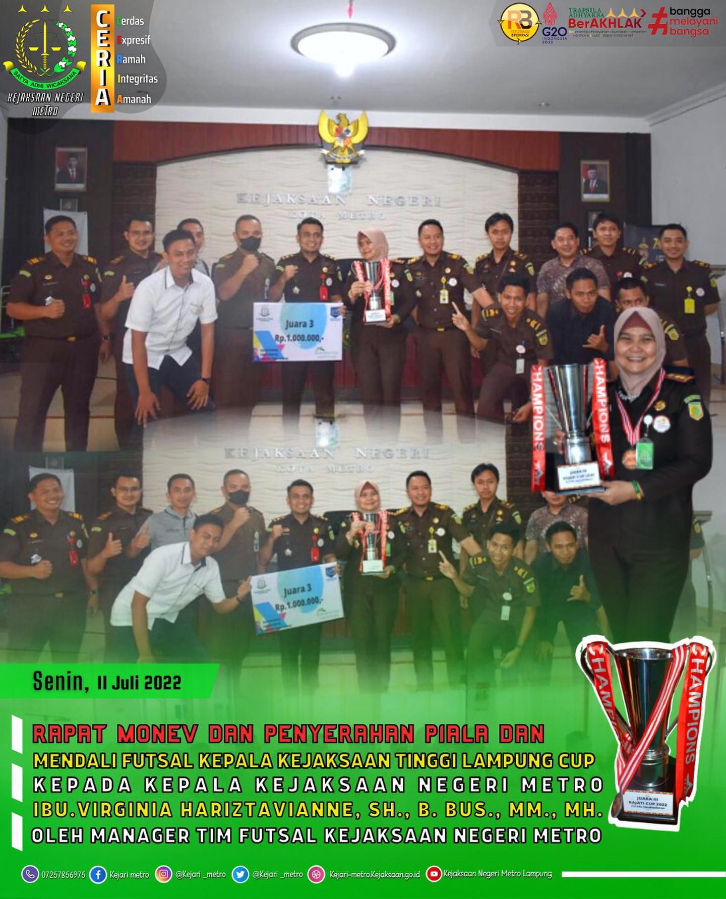 Rapat Monev dan penyerahan Piala dan Mendali Futsal Kepala Kejaksaan Tinggi Lampung Cup kepada Kepala Kejaksaan Negeri Metro ibu. Virginia hariztavianne, SH., B. BUS., MM., MH. oleh Manager Tim Futsal Kejaksaan Negeri Metro.