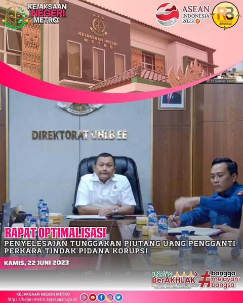 pada hari ini kamis tanggal 22 juni 2023 Kejaksaan Negeri Metro Mengikuti Rapat Optimalisasi Penyelesaian Tunggakan Piutang Uang Pengganti Perkara Tindak Pidana Korupsi Secara Virtual.
