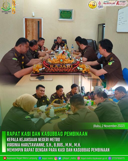 Kepala Kejaksaan Negeri Metro Virginia Hariztavianne, S.H., B.Bus., M.M., M.H. Memimpin Rapat Dengan Para Kasi dan Kasubbag Pembinaan.