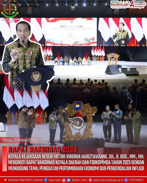 Kepala Kejaksaan Negeri Metro Virginia Hariztavianne, SH., B. BUS., MM., MH. Mengikuti Rapat Rakornas Kepala Daerah dan Forkopimda Tahun 2023 Dengan Mengusung Tema; Penguatan Pertumbuhan Ekonomi Dan Pengendalian Inflasi.