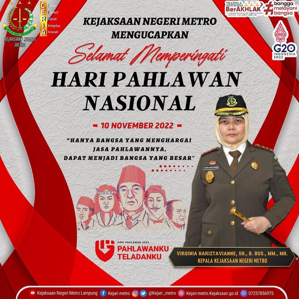 Kejaksaan Negeri Metro beserta jajarannya mengucapkan Selamat Memperingati Hari Pahlawan Nasional 10 November 2022. Pahlawanku Teladanku.