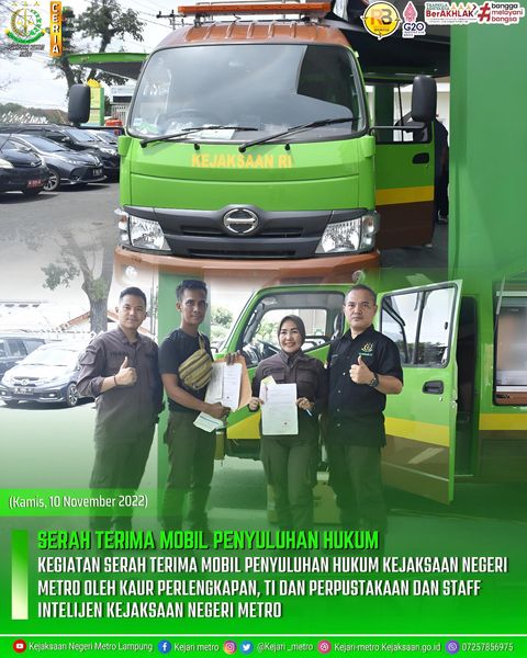 (Kamis, 10 November 2022) Kegiatan Serah Terima Mobil Penyuluhan Hukum Kejaksaan Negeri Metro oleh Kaur Perlengkapan, TI dan Perpustakaan dan Staff Intelijen Kejaksaan Negeri Metro.