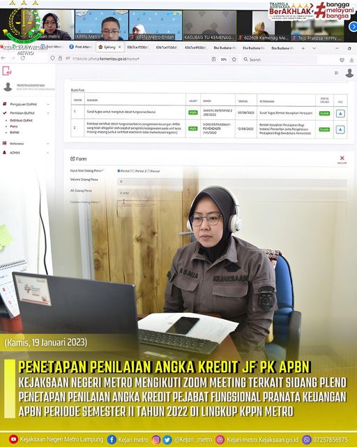 Kejaksaan Negeri Metro Mengikuti Zoom Meeting Terkait Sidang Pleno Penetapan Penilaian Angka Kredit Pejabat Fungsional Pranata Keuangan APBN Periode Semester II Tahun 2022 di Lingkup KPPN Metro.