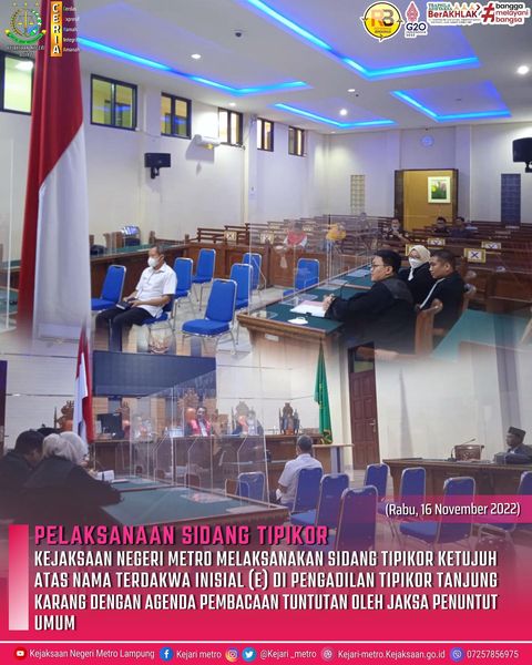 Kejaksaan Negeri Metro melaksanakan sidang Tipikor ketujuh atas nama terdakwa Inisial (E) di pengadilan tipikor tanjung karang dengan agenda pembacaan tuntutan oleh jaksa penuntut umum.