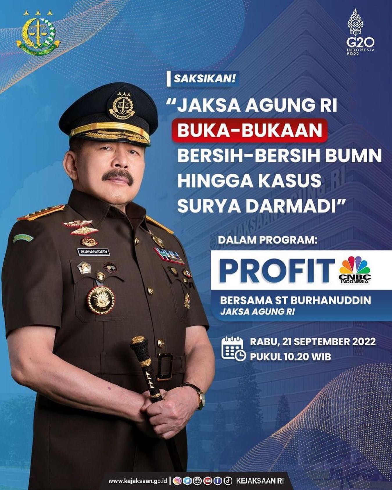 Sobat Adhyaksa, jangan lupa saksikan program PROFIT CNBC Indonesia bersama Jaksa Agung RI Burhanuddin dengan tema “Jaksa Agung RI Buka-bukaan Bersih-bersih BUMN Hingga Kasus Surya Darmadi” pada Rabu, 21 September 2022 Pukul 10.20 WIB.