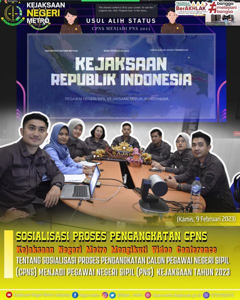 Kejaksaan Negeri Metro Mengikuti Video Conference Tentang Sosialisasi Proses Pengangkatan Calon Pegawai Negeri SIPIL (CPNS) Menjadi Pegawai Negeri Sipil (PNS) Kejaksaan Tahun 2023.