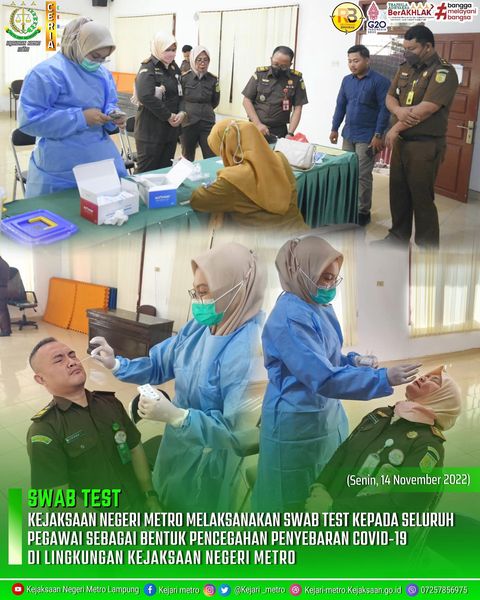(Senin, 14 November 2022) Kejaksaan negeri Metro Melaksanakan Swab Test Kepada Seluruh Pegawai Sebagai Bentuk Pencegahan Penyebaran Covid-19 di Lingkungan Kejaksaan Negeri Metro.