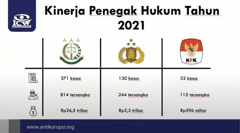 Data dari ICW yang dipublikasikan kemarin soal Tren Penindakan Korupsi Aparat Penegak Hukum 2021 menyebutkan bahwa Kejaksaan Agung diberi nilai B. Penilaian itu lebih baik dari KPK (D) dan Polri (E).